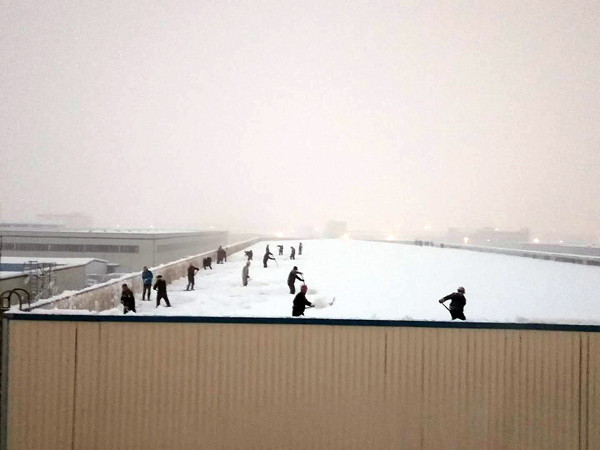 4日早上,浩淼公司領(lǐng)導(dǎo)和員工冒著紛飛大雪陸續(xù)到公司上班,親眼見(jiàn)證了公司成品庫(kù)和制泵車間先后被大雪壓塌。為了防止雪災(zāi)繼續(xù)擴(kuò)大,把損失降到最低程度,在董事長(zhǎng)的號(hào)召帶領(lǐng)導(dǎo)下,廣大員工迅速投入掃雪減災(zāi)之中,組織部分員工對(duì)廠區(qū)的道路廣場(chǎng)進(jìn)行清理,部分員工對(duì)廠房上的積雪進(jìn)行處置,以減輕廠房負(fù)重所帶來(lái)的危險(xiǎn),防止后續(xù)降雪可能帶來(lái)的災(zāi)害。除雪中,共產(chǎn)黨員和車間骨干和一線員工踴躍參與。共產(chǎn)黨員林墅、周波、湯雷等同志發(fā)揮了模范帶頭作用。
