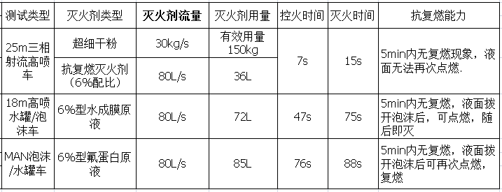 三相射流技術(shù)是一種集多種類型滅火劑優(yōu)點于一身的技術(shù),對石油化工火災(zāi)的滅火效果尤其突出。為驗證三相射流消防車的滅火效果,本公司與公安部滅火救援重點實驗室合 作,對三相射流與消防部隊目前常用的氟蛋白泡沫滅火劑和水成膜泡沫滅火劑進行滅火效能對比試驗,對所選滅火劑的用量、控火時間、滅火時間和抗復(fù)燃性等滅火技術(shù)參數(shù)進行對比。